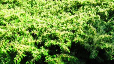 Bloeit van juli tot de herfst met gele bloemen waar bijen graag hun kostje halen. Prima, maar ook deze is af te raden voor een drukbezet persoon en voor de luie tuinier. - Duivelswandelstok (Aralia elata)
