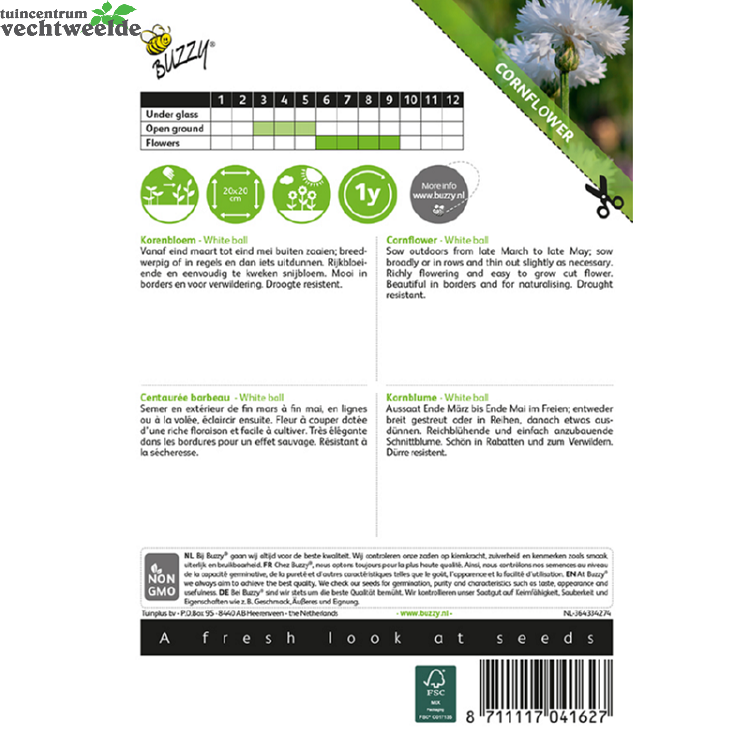 Schrijf zelf een recensie over "Centaurea cyanus white ball 1g"
