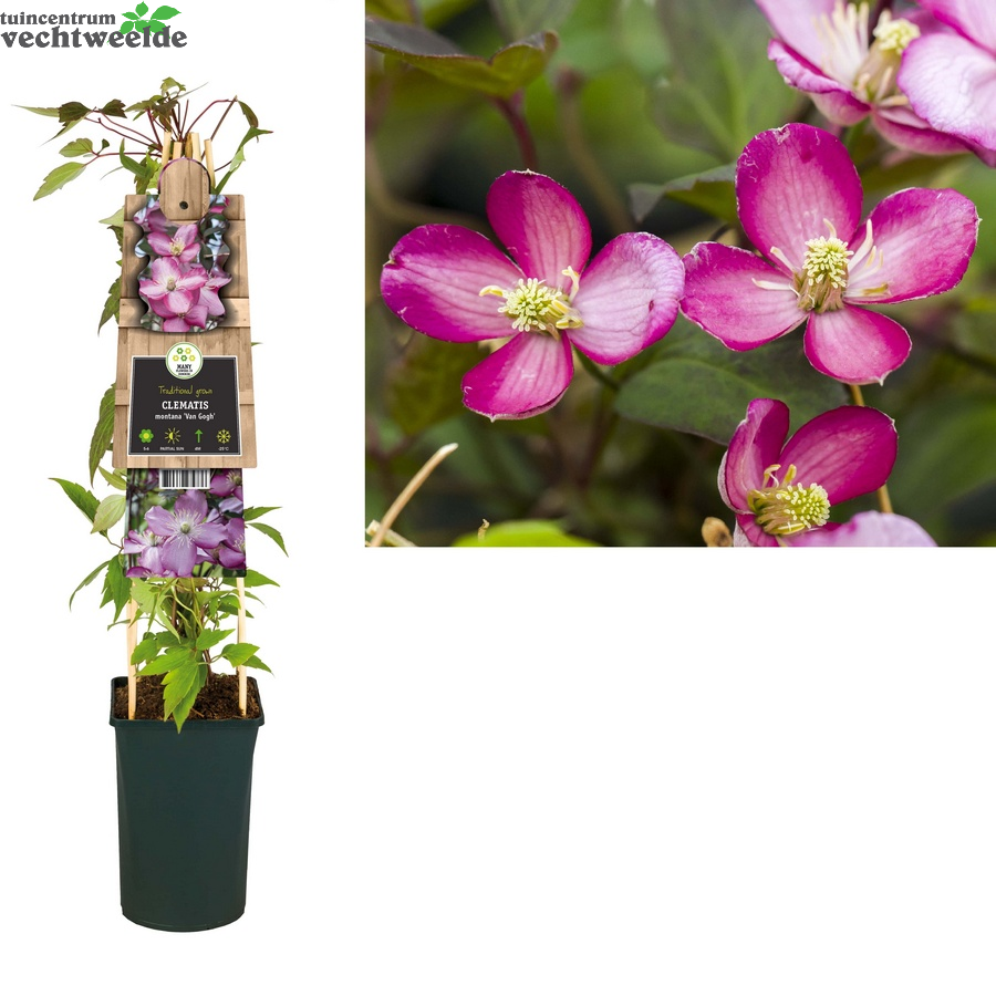 Wilt u Clematis montana 'Van Gogh' kopen? Kom langs in ons sfeervolle tuincentrum en laat u inspireren. We helpen u graag en geven vakkundig advies om uw huis & tuin mooi te maken!