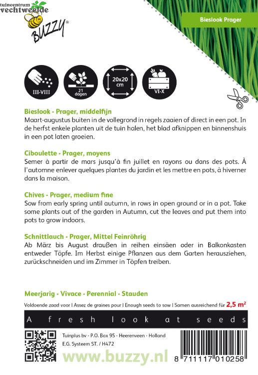 Bieslook - Prager middelfijn Vanaf maart tot augustus buiten in regeltjes of in bloempotten. In de herfst enkele planten uit de tuin in een pot zetten, blad afknippen en binnenshuis laten groeien.
