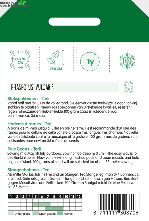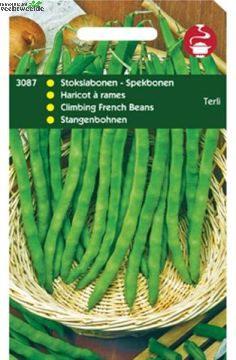 Stokspekbonen - Terli Vanaf half mei tot juli in de vollegrond. De eenvoudigste teeltwijze is door (tonkin) stokken te plaatsen. Nieuw ras spekbonen van uitstekende kwaliteit; resistent tegen rolmozaïek en vlekkenziekte. 100 gram zaad is voldoende voor een rij van ca. 35 meter.
