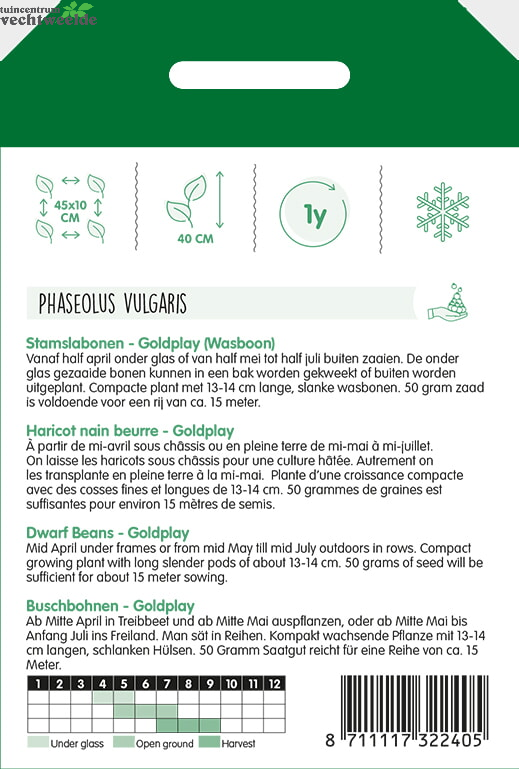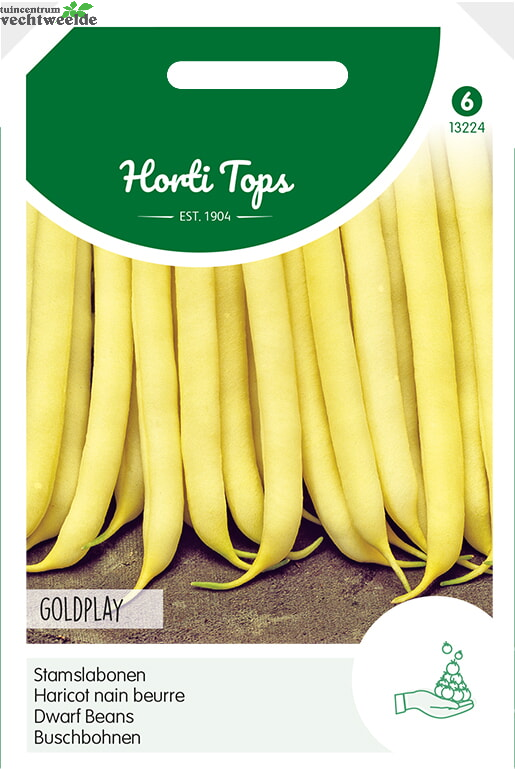 Stamslabonen - Goldplay (Wasboon) Vanaf half april onder glas of van half mei tot half juli buiten zaaien. De onder glas gezaaide bonen kunnen in een bak worden gekweekt of buiten worden uitgeplant. Compacte plant met 13-14 cm lange, slanke wasbonen. 50 gram zaad is voldoende voor een rij van ca. 15 meter.
