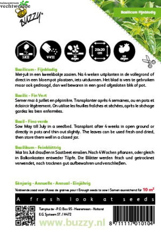 Wilt u Basilicum fijn 1.5g kopen? Kom langs in ons sfeervolle tuincentrum en laat u inspireren. We helpen u graag en geven vakkundig advies om uw huis & tuin mooi te maken!