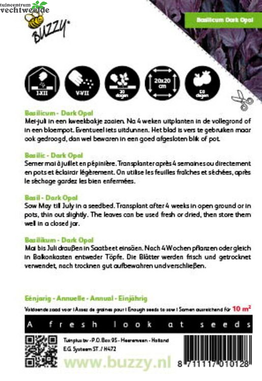 Basilicum - Dark Opal Mei tot juli in een kweekbakje en na ca. Vier weken uitplanten, of in een bloempot en wat uitdunnen. Het blad kan je vers gebruiken maar ook gedroogd; wel bewaren in een goed afgesloten blik of pot.