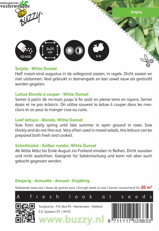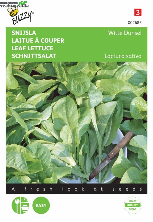 Snijsla - Witte Dunsel Half maart-eind augustus in de vollegrond zaaien, in regels. Dicht zaaien en niet uitdunnen. Veel gebruikt in slamengsels en kan zowel rauw als gestoofd worden gegeten.