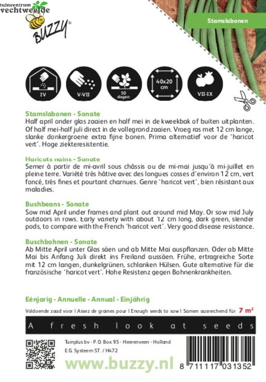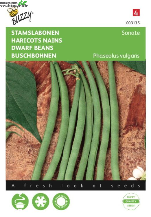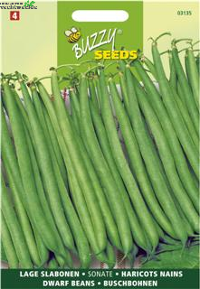 Stamslabonen - Sonate Half april onder glas zaaien en half mei in de kweekbak of buiten uitplanten. Of half mei-half juli direct in de vollegrond zaaien. Vroeg ras met 12 cm lange, slanke donkergroene extra fijne bonen. Prima alternatief voor de ‘haricot vert’. Hoge ziekteresistentie.