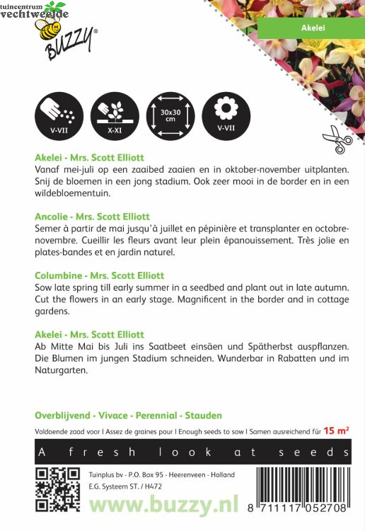 Akelei - Mrs. Scott Elliott Vanaf mei-juli op een zaaibed zaaien en in oktober-november uitplanten. Snij de bloemen in een jong stadium. Ook zeer mooi in de border en in een wildebloementuin.