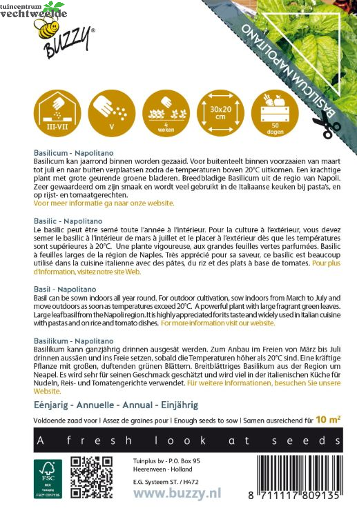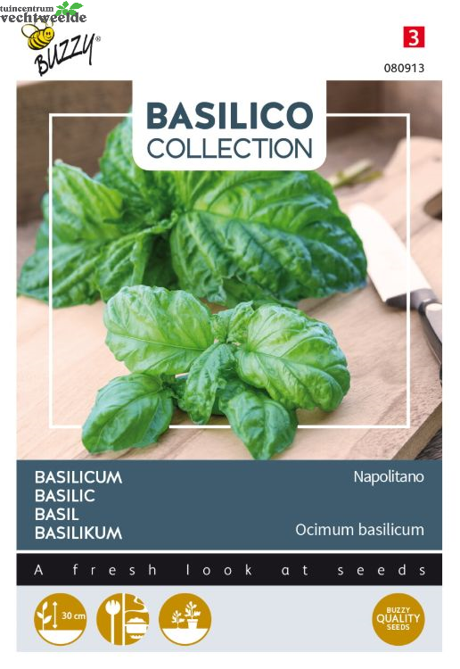 Een krachtige plant met grote geurende groene bladeren. Breedbladige Basilicum uit de regio van Napoli. Zeer gewaardeerd om zijn smaak en wordt veel gebruikt in de Italiaanse keuken bij pasta’s, en op rijst- en tomaatgerechten.