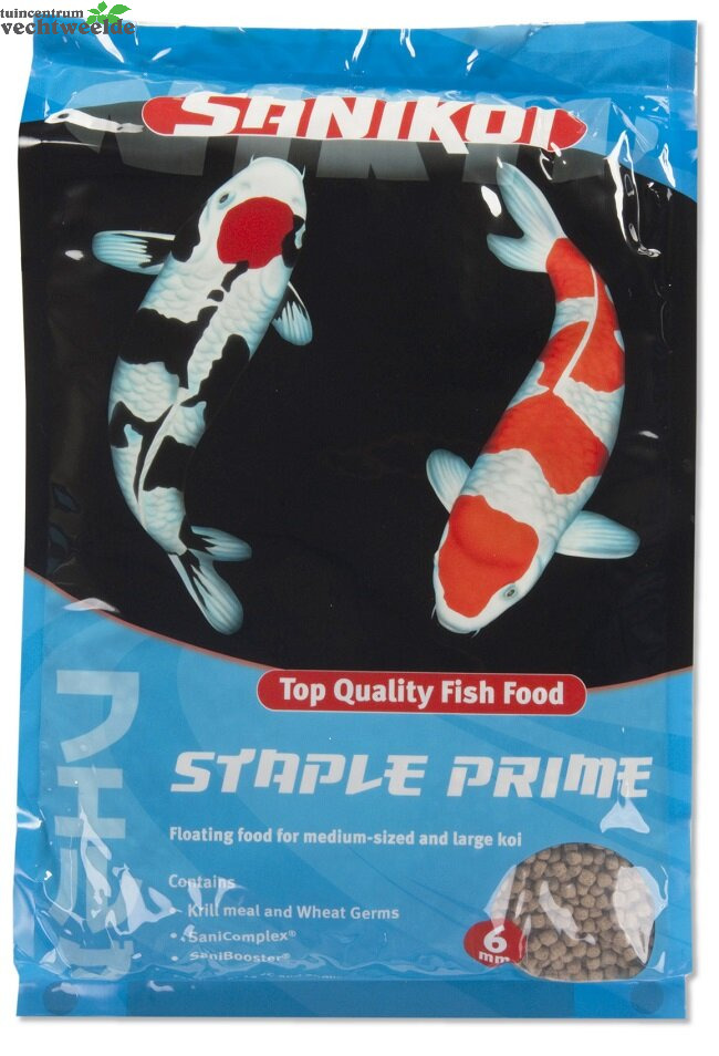 SaniKoi Staple Prime is een top quality food voor Japanse koi en andere waardevolle karperachtigen. Het is een drijvend voeder dat een natuurlijk kleurpatroon kan bevorderen. De hoofdbestanddelen bestaan uit vis- en zeevruchtproducten, plantaardige eiwitten, vetten, koolhydraten en aangevuld met krillmeel en tarwekiemen. Speciale aandacht is gegeven aan de toegevoegde sporenelementen en vitaminen, waaronder het gestabiliseerde vitamine C. Het SaniKoi Food is een drijvend hoofdvoer dat wordt gebruikt bij watertemperaturen vanaf 12 °C. Voer een aantal keren per dag. Zorg ervoor dat het voer binnen 5 minuten gegeten wordt. Door de speciale samenstelling van het voer vertroebelt het water niet en wordt het vijvermilieu en het filter nagenoeg niet belast.Verkrijgbaar als 6 mm korrel in handige stazakken van 3, 10 en 20 liter.