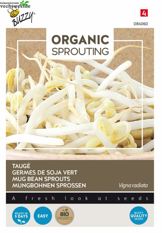 Taugé Spruitgroente kan eenvoudig met water worden opgekweekt. Taugé is lekker fris en knapperig, smaakt voortreffelijk in roerbakschotels maar ook in salades en zelfs in soepen. Voor het gebruik even in heet water dompelen of wokken. Rijk aan vitamine B. Strooi het zaad in een dun laagje op het zaairooster en spoel dit voorzichtig onder de kraan. Vul de glazen bowl met water tot de onderzijde van het rooster en plaats deze in een donkere ruimte met een normale kamertemperatuur ( 20-22C ). Ververs iedere dag het water. U kunt ook een leeg boterbakje vullen met natte watten en hier de zaden op strooien. De watten goed vochtig houden en u kunt genieten van uw eigen gekweekte Kiemgroenten. Na 5 dagen kunt u de kiemspruiten (die dan 3-5 cm lang zijn) eten. Tauge moet voor het consumeren even worden verhit.