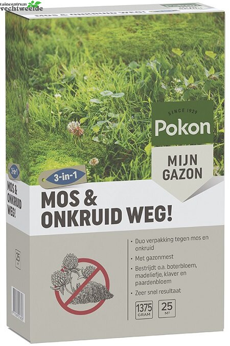 Last van mos en onkruid in het gazon? Een effectieve en snelle manier om het gazon weer mooi te krijgen, is het gebruik van Pokon Mos en Onkruid Weg!. Deze gazonmest met onkruidbestrijder en gazonmest met mosbestrijder bevatten extra voeding voor een goed herstel van het gazon. Pokon Mos Weg! geeft voeding aan het gazon en werkt snel en effectief tegen mossen in gazons. Onkruid Weg! geeft voeding aan het gazon en is werkzaam tegen weegbree, madeliefje en witte klaver. Minder gevoelig voor dit product zijn kruipende boterbloem en paardenbloem.