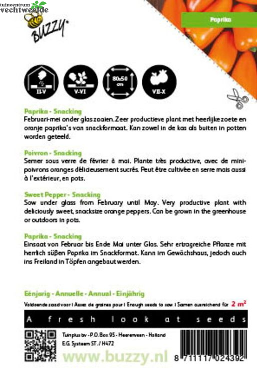 Paprika - Snacking mini oranje Zaaien van februari tot en met mei onder glas. Zeer productieve plant van heerlijk zoete oranje parika’s van snack formaat. Kan in de kas maar ook buiten in potten worden geteeld.