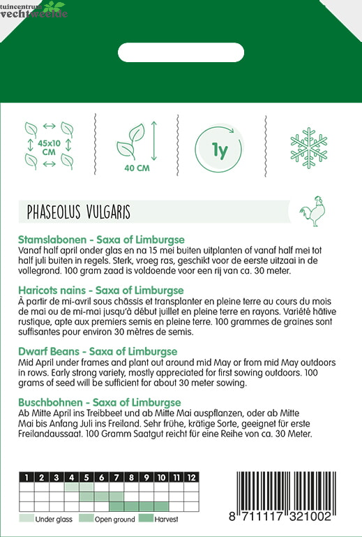 Stamslabonen - Saxa of Limburgse Vanaf half april onder glas en na 15 mei buiten uitplanten of vanaf half mei tot half juli buiten in regels. Sterk, vroeg ras, geschikt voor de eerste uitzaai in de vollegrond. 100 gram zaad is voldoende voor een rij van ca. 30 meter.