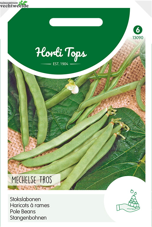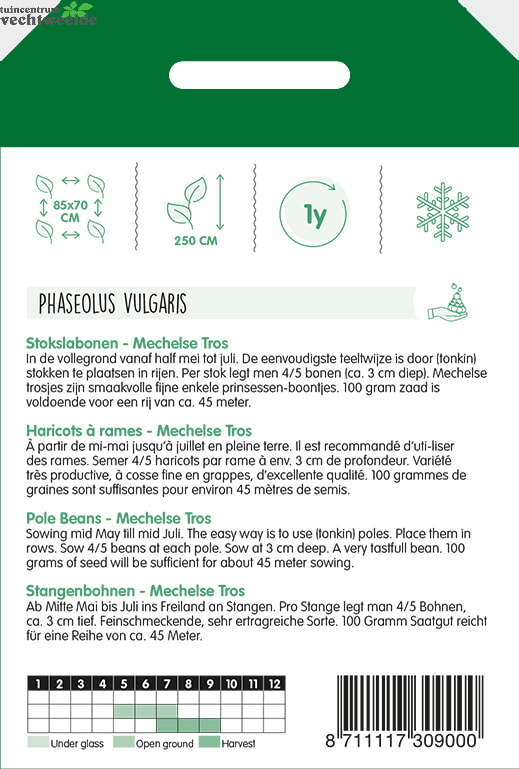 Stokslabonen - Mechelse Tros Zaaien in de vollegrond vanaf half mei tot juli. De eenvoudigste teeltwijze is door (tonkin) stokken te plaatsen in rijen. Per stok legt men 4/5 bonen (ca. 3 cm diep). Mechelse trosjes zijn smaakvolle fi jne enkele prinsessen-boontjes. 100 gram zaad is voldoende voor een rij van ca. 45 meter.