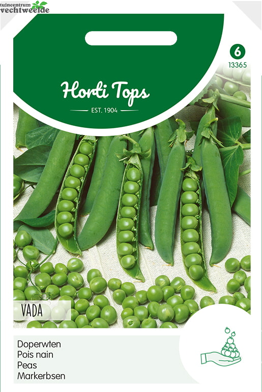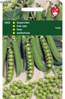Doperwten - Vada Vanaf begin maart tot half mei in de vollegrond in regels. Ca. 2-3 cm diep. Kan eventueel zonder gaas worden opgekweekt; de hoogte is ca. 70-80 cm. Middelvroeg productief ras met blauwgroene spitse peulen. 100 gram zaad is voldoende voor een rij van ca. 10-15 meter.