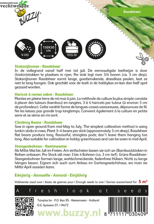 (tonkin)stokken te plaatsen in rijen. Per stok legt men 3/4 bonen (ca. 3 cm diep). Stoksnijbonen Raadsheer vormt lange, goedsmakende, draadloze peulen, laat ze niet te lang hangen. Ook geschikt voor de teelt in de hobbykas en kan dan half april gezaaid worden.