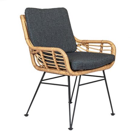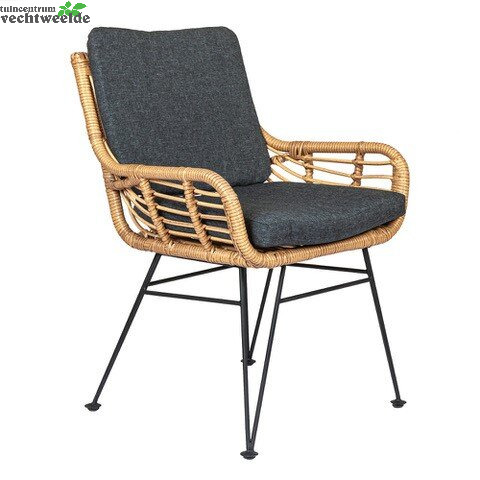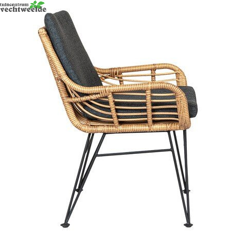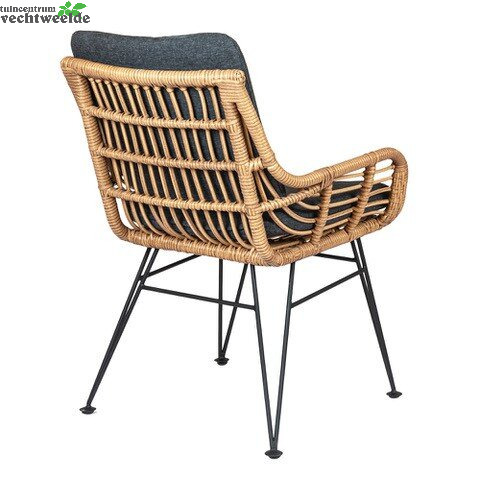 Dit rotan look tuinmeubel past helemaal in botanische trend van dit moment staat prachtig in iedere tuin of terras. Het grote voordeel ten opzichte van echt rotan is dat dit meubel in de weersinvloeden kan staan om dat het gemaakt is wicker. In de stoel zit een rug- en zitkussen met rits die behandeld zijn met een vuil afstotende laag.