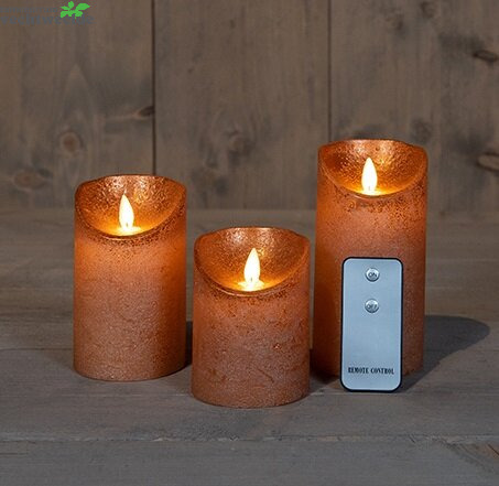 Kaars wax rustiek met vlam met afstandsbediening koper op batterijen 3 stuks